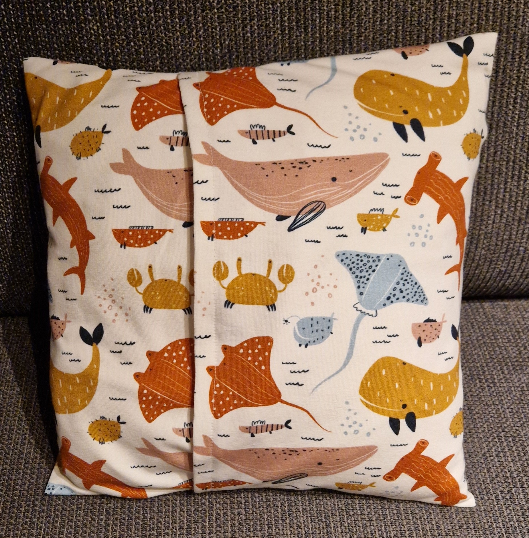 Deze kussen heeft een overlap aan de achterzijde. De hoes mag binnenstebuiten in de wasmachine op 30°